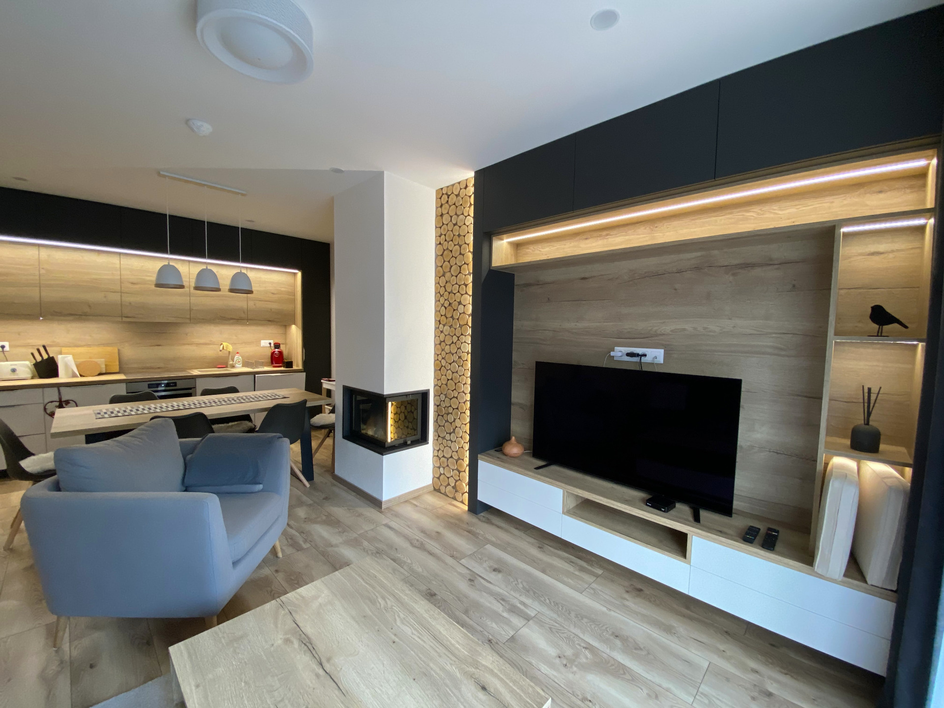 V obývačke sa nachádza rozťahovacia pohovka s kreslom, krb, veľkoplošná TV. Na lodgii sa nachádza príjemné sedenie na rannú či poobedňajšiu kávu.